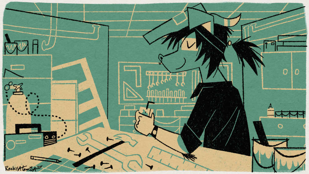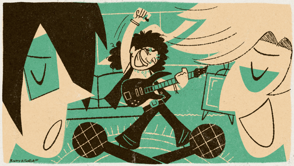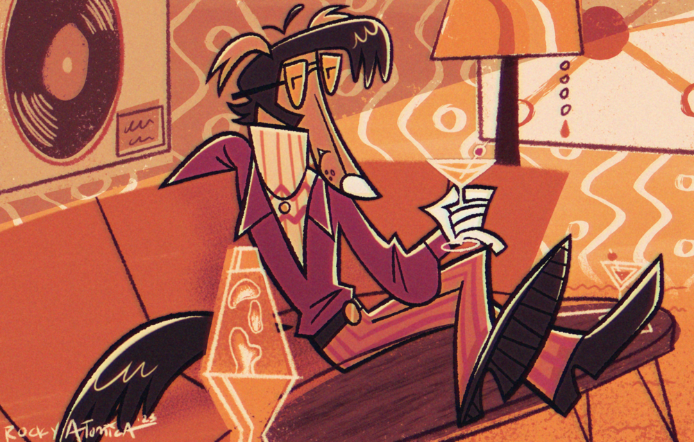 A simple 3 color (black, off-white, a color of choice) character focused illustration in a mid-century art style. Piece includes a background setting. NOTE: The drawn character would range from a bust to full body depending on piece composition.