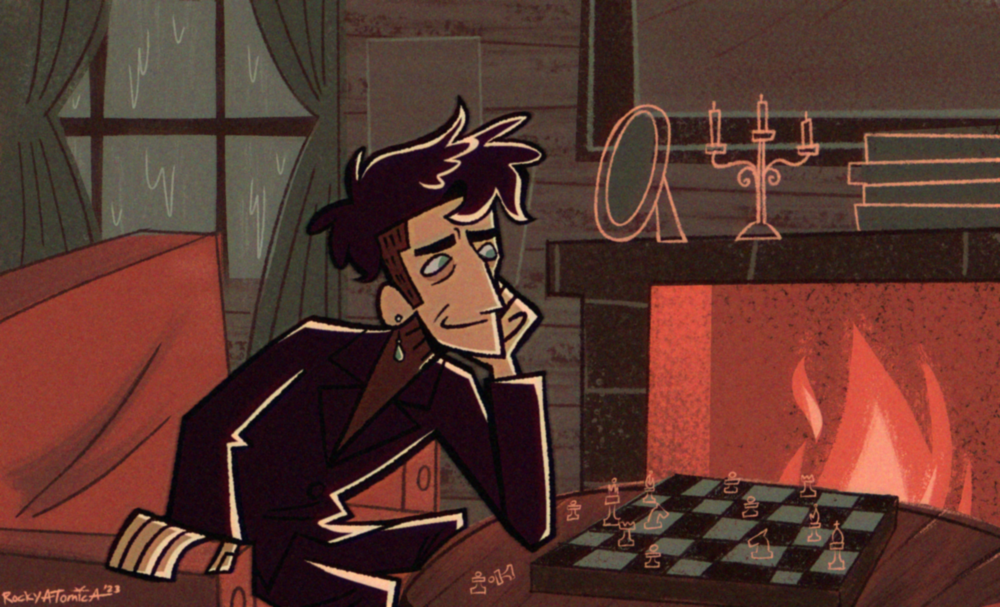 A character focused illustration of your character of choice on a background. The composition of the piece